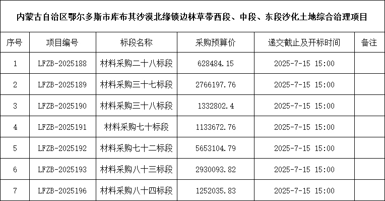 內(nèi)蒙古利凡工程項目管理有限公司受鄂爾多斯市水投惠源建設(shè)有限公司的委托,采用比選的方式,對內(nèi)蒙古自治區(qū)鄂爾多斯市庫布其沙漠北緣鎖邊林草帶西段、中段、東段沙化土地綜合治理項目--材料采購7個標段進行采購,歡迎符合資格條件的應(yīng)選人前來參加: