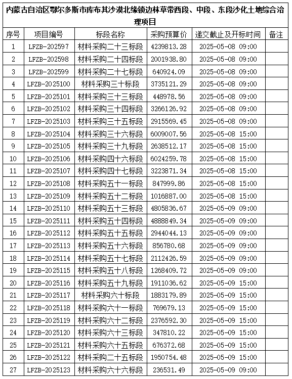 內(nèi)蒙古利凡工程項(xiàng)目管理有限公司受鄂爾多斯市水投惠源建設(shè)有限公司的委托,采用比選的方式,對(duì)內(nèi)蒙古自治區(qū)鄂爾多斯市庫(kù)布其沙漠北緣鎖邊林草帶西段、中段、東段沙化土地綜合治理項(xiàng)目--材料采購(gòu)27個(gè)標(biāo)段進(jìn)行采購(gòu),歡迎符合資格條件的應(yīng)選人前來(lái)參加: