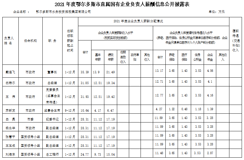 備注:本披露表由企業(yè)主管部門按照批復(fù)的區(qū)直企業(yè)負(fù)責(zé)人薪酬實(shí)施方案有關(guān)數(shù)據(jù)填寫;任命機(jī)構(gòu)欄根據(jù)企業(yè)負(fù)責(zé)人任命情況按自治區(qū)黨委、政府及部門(名稱)進(jìn)行填寫;負(fù)責(zé)人姓名和職務(wù)欄按企業(yè)負(fù)責(zé)人排名順序逐人填寫;任職領(lǐng)取薪酬起止時(shí)間為組織任命到本企業(yè)本年度領(lǐng)取企業(yè)負(fù)責(zé)人薪酬的起止時(shí)間;養(yǎng)老保險(xiǎn)和醫(yī)療保險(xiǎn)單位繳存數(shù)額對(duì)應(yīng)個(gè)人繳存基數(shù)和按照單位繳費(fèi)比例確定;履職待遇欄的交通補(bǔ)貼,由已實(shí)施公務(wù)用車制度改革并以現(xiàn)金形式發(fā)放公車補(bǔ)貼的企業(yè)填報(bào);其他欄按照選項(xiàng)逐人逐項(xiàng)填寫。